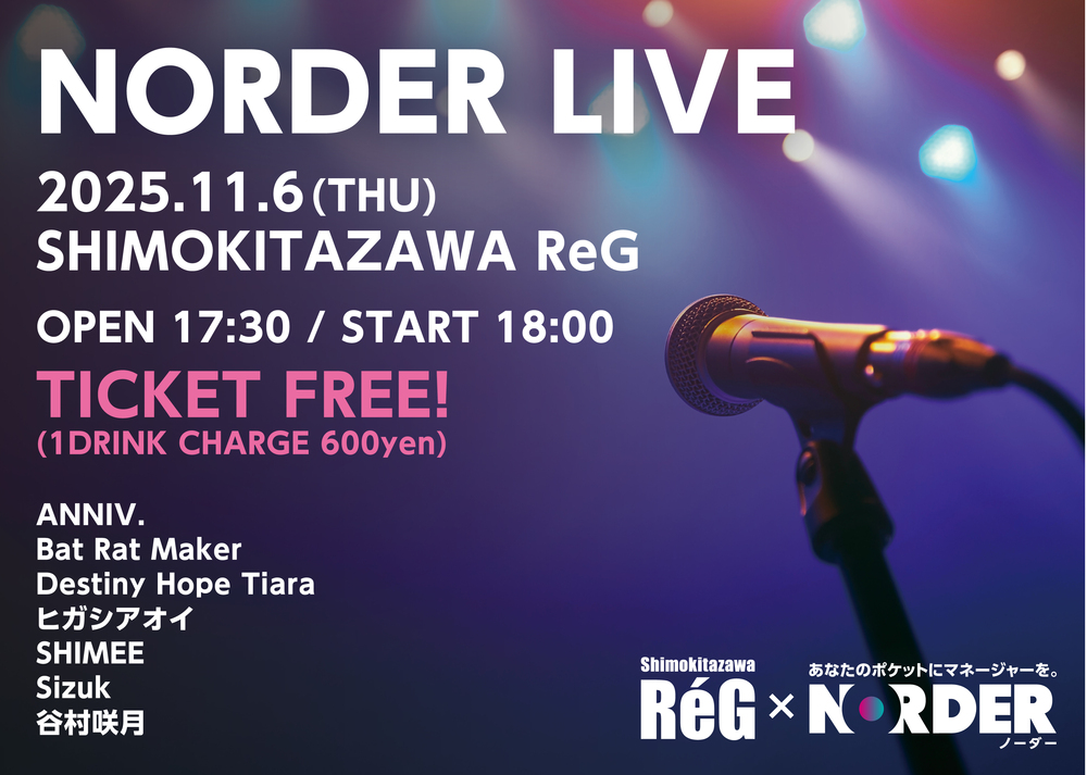 NORDER LIVE LIVE Schedule 2025/11/06(木) 18:00 - 下北沢ReG チケット無料! 出番は19:00頃! チケット予約はDMにて ぜひきてね〜 URLをコピーする 報告する